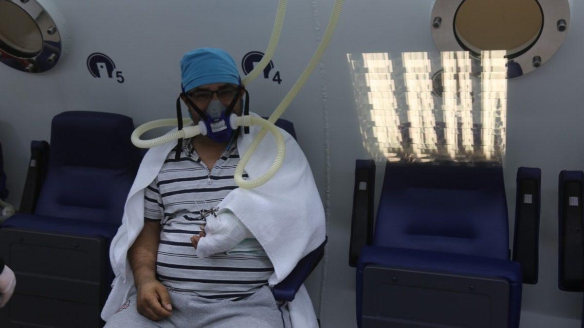 Hiperbarik Ünitesi Sorumlusu Su Altı Hekimliği Uzmanı Uzm. Dr. Mehmet Emin Akçıl’da, Ahmet Bilge’nin geldiği zaman elinde büyük bir hasar olduğunun altını çizerek, "Avuç içinde yarası vardı. Ortopedi Kliniğinden el cerrahisi arkadaşlarımız gerekli müdahaleyi yapmışlardı ve hastayı beraber takip ediyorduk. Takip sürecinde hastamızda siyanoz dediğimiz dolaşımda bozukluk durumu ortaya çıktı. Dolaşım azaldığı durumlarda uzuvlarda meydana çıkan morarma ortaya çıkmıştı. Bu durumda arkadaşlar hastamızı bir de benim konsülte etmemi istediler. Hiperbarik oksijen tedavisi verebilir miyiz çünkü uzuvlarda morarmalar var dediler. Hastayı konsülte ettikten sonra hiperbarik oksijen tedavisine aldık. Tedaviye başladıktan 3 gün sonra morarmanın gerilediğini, diğer yaralarında hızlı bir şekilde iyileştiğini gözlemledik. Hastamız hala takibimizde ve yaraları çok iyi durumda şu anda. Önümüzdeki günlerde de alacağı fizik tedavi ile elinin bütün fonksiyonlarını tekrar geri kazanacağını düşünüyoruz” şeklinde konuştu.