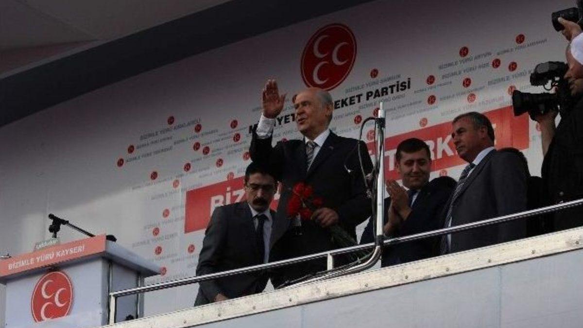 MHP Genel Başkanı Devlet Bahçeli, hükümetin Türkiye’ye vereceği bir şey kalmadığını savunarak, “Milli hesaplaşmadan kaçamayacaksınız. Milliyetçi Hareket mazlumun, işsizin hesabını sormak için 7 Haziran’ı bekliyor” dedi.MHP Genel Başkanı Devlet Bahçeli, Kayseri Cumhuriyet Meydanı’nda düzenlenen mitingde halka hitap etti. Bahçeli, “Rahmetli Başbuğumuzun ata toprağında bulunmaktan onur duyuyorum. Biz Kayseri’yi öteden beri onurlu, dik duruşlu, tuttuğunu koparan, işinin ehli, uzağı gören insanlar olarak tanırız. Bu kanaatimizde hiçbir eksilme yoktur. Kayserili kardeşlerimi suçlayan, alay eden ve çarpıtan gafilleri görünce geriliyor ve öfkeleniyoruz” dedi.Bahçeli, “17-25 Erdoğan’a anasını, babasını, kendisini ve çocuklarını kurban etmek için beyanat veren iş adamı, rüşvet havuzunun içine çökmüş bir tortu Kayseri’ye hakaret etti. Havuz medyasında köşe tutunmuş bu sonradan görme, maalesef ‘Karadenizliler bir şeye inandılar mı sonuna kadar giderler, yanlış da olsa doğru da olsa giderler, Kayserililer para olmazsa gitmezler’ dedi. Kayserili kardeşlerim bu çirkin sözlere layık değilsiniz. Bu sözleri hak etmiyorsunuz. Kayserilileri çıkarcı olarak tanımlamak bu aziz şehre en ağır bühtandır. Biz hayasız sözleri reddediyoruz. İğrenç benzetmeyi muhatabına iade ediyoruz. Kayserili çalışkandır, yüreklidir. Bunu çıkarcılar anlayamaz. Kayserili şereflidir. Bunlardan nasibini almayanların Kayseri’ye şaşı bakmaları bozuk fıtratlarına uygundur. AKP’ye oy veren hemşerilerim bunların gerçek yüzünü tanıyın” diye konuştu.“11. Cumhurbaşkanı Abdullah Gül’e yapılan haksızlıkları fark edin” diyen Bahçeli, şunları kaydetti:“İster beğenelim ister etmeyelim. Sayın Gül Cumhurbaşkanlığı görevini yasaya bağlı olarak yürütmüştür. Şeklen de olsa siyasi tarafsızlığını muhafaza etmek için çaba sarf etmiştir. Fakat sayın Gül Cumhurbaşkanlığı makamının ağırlığını sabırla taşımayı bilmiştir. Kayseri’ye hakaret edenleri yanında gezdiren, her türlü kanunsuzluktan fayda uman Erdoğan’a bakın, bir de Sayın Gül’e bakın. Kardeşim dediği kişiye çalım atan, dirsek çeviren Erdoğan’ın vefası mezara kadar değil, menfaati bitene kadardır. Erdoğan’ın gözünde Kayseri’nin hükmü yoktur. Kayseriliyi kötüleyen havuzcular sizin hakkınızı çalarak köşeyi dönmektedir. 12 yıl Türkiye’yi Başbakan olarak yöneten Erdoğan oy istiyor ve yeni yeni ünvanlar istiyor.”“Kayseri’nin karamsar tablosunda istikrar yok, gelecek yok” diyen Bahçeli, “Erdoğan Merkez Bankası ile kavga etti döviz çıktı, ceremesini vatandaş çekti. Erdoğan zenginleşti, Davutoğlu el etek öptü, sizler borçlandınız. Bu gün Türkiye’de 44 milyon vatandaşımız iki günde bir kap et yemeği yiyememektedir. 26 milyon insan kendine yeni bir elbise almaktan uzaktır.Bu zihniyete göre bugüne kadar parlamenter sistem hep engel olmuştur. Davutoğlu şimdi çıkmış ana yasa çoğunluğu çıkarsa tereddüt etmem koltuğu bırakırım demiş, bu söz millete nankörlük, demokrasiye ihanettir. Başbakanlık koltuğundan zaten ineceksen niye meydan meydan dolaşıyorsun. Ne hakla umutlarla oynuyor MHP’ye iftiralar atıyorsun? Davutoğlu şunu kesinlikle kabul et ki hem kendini yaktın hem de senden beklentisi olanları yıktın. Gittin Erdoğan’ın paryası oldun. Başbakanlığı esasen bırakmana gerek yok, sahip olmadığın olamayacağın koltukta zaten bulunmuyordun.AKP hükümetinin Türkiye’ye vereceği bir şey kalmamıştır. Artık sonunuz geldi, yaptıklarınızın bedelini ödeyeceksiniz. Milli hesaplaşmadan kaçamayacaksınız. Milliyetçi Hareket mazlumun, işsizin hesabını sormak için 7 Haziran’ı bekliyor.”Bahçeli konuşmasının sonunda MHP’nin seçim beyannamesini anlattı.