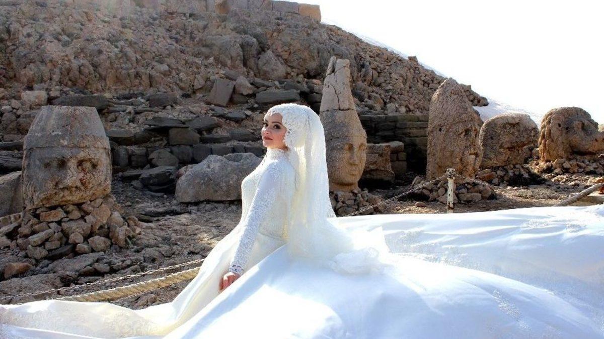 Devasa heykellerin bulunduğu Nemrut Dağında katalog çekimleri için gelinlik giyen mankenler birbirinden güzel pozları fotoğrafçılar için verdi.Ünlü bir gelinlik firması için 2 bin 206 metre yüksekliğe zorlu bir tırmanış gerçekleştiren mankenler, soğuk hava ve rüzgar eşliğinde çekim yapmak zorunda kaldı. Yaklaşık 25 kişilik ekiple zirveye çıkan mankenler Kommagene Uygarlığı’ndan kalma 2 bin yıllık heykeller ile poz verdi.Çekimler sırasında rüzgarın azizliğine uğrayan ve zaman zaman zorlanan mankenler, katalog çekimini zor şartlar altından gerçekleştirdi. Nemrut Dağının doğu ve batı terasında bulunan heykellerin önünde yapılan çekimler zor olduğu kadar eğlenceli de geçti.Mankenlerden Ercil Yavuz, zirvede "Nemrut’un kızı” türküsünü seslendirdi. Tümülüsün kuzey yönündeki kardan güçlükle ilerleyen mankenlere, ekipteki diğer kişiler yardım etti.Setr-i Nur Firmasının sahibi Suna Yurtalan, amaçlarının Nemrut Dağının reklamını yapmak olduğunu belirterek, "İstedik ki Nemrut Dağı ve Adıyaman’ın tanıtımını yapalım. Burada katalog çekimini yapmaya karar verdik. Zirveye zorlu bir çıkış yaptık. Adıyaman’ı ve Nemrut’u dünyanın her yerine tanıtacağız. Görmeyenler, Nemrut Dağı ile alakalı fikri olmayanlar için inşallah tanıtıcı bir görsel olacak” ifadelerini kullandı.Manken Ercil Yavuz, 2 bin 206 metre yükseklikteki devasa heykeller arasında çekim yapmanın ayrı bir güzelliğinin olduğuna vurgulayarak, "Mitolojik karakterlerin heykelleri arasında çekim yapmak ayrı bur duygu. Adıyaman’ı çok beğendik ve Nemrut’u ilk defa görüyorum. Burası harika, ülkemizin keşfedilmemiş çok güzel yerlerinden birisi. Burada olmaktan ve çekim yapmaktan çok mutluyuz” dedi.Manken Meryem Dülger ise "Nemrut Dağına çekim için geldik. Hem mutluyuz, hem yorgunuz. Çok güzel işler çıkardık. Nemrut Dağı insanı gerçekten farklı hissettiren bir yer. Fiziksel olarak bunu hissediyorsunuz. Burayı görmüş olmanın büyük şans olduğunu düşünüyorum” ifadelerini kullandı.
