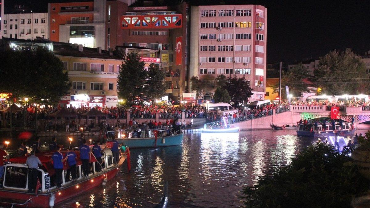 30 Ağustos Zafer Bayramı dolayısıyla Eskişehir’in kent merkezini ikiye ayıran Porsuk Çayı’nda vatandaşların da yoğun katılımıyla Fener Alayı geçidi gerçekleştirildi. Porsuk Çayı’nı Adalar mevkiine bağlayan Köprübaşı girişindeki sularda başlayan programda okunan coşkulu şiirler vatandaşlardan büyük alkış aldı.
