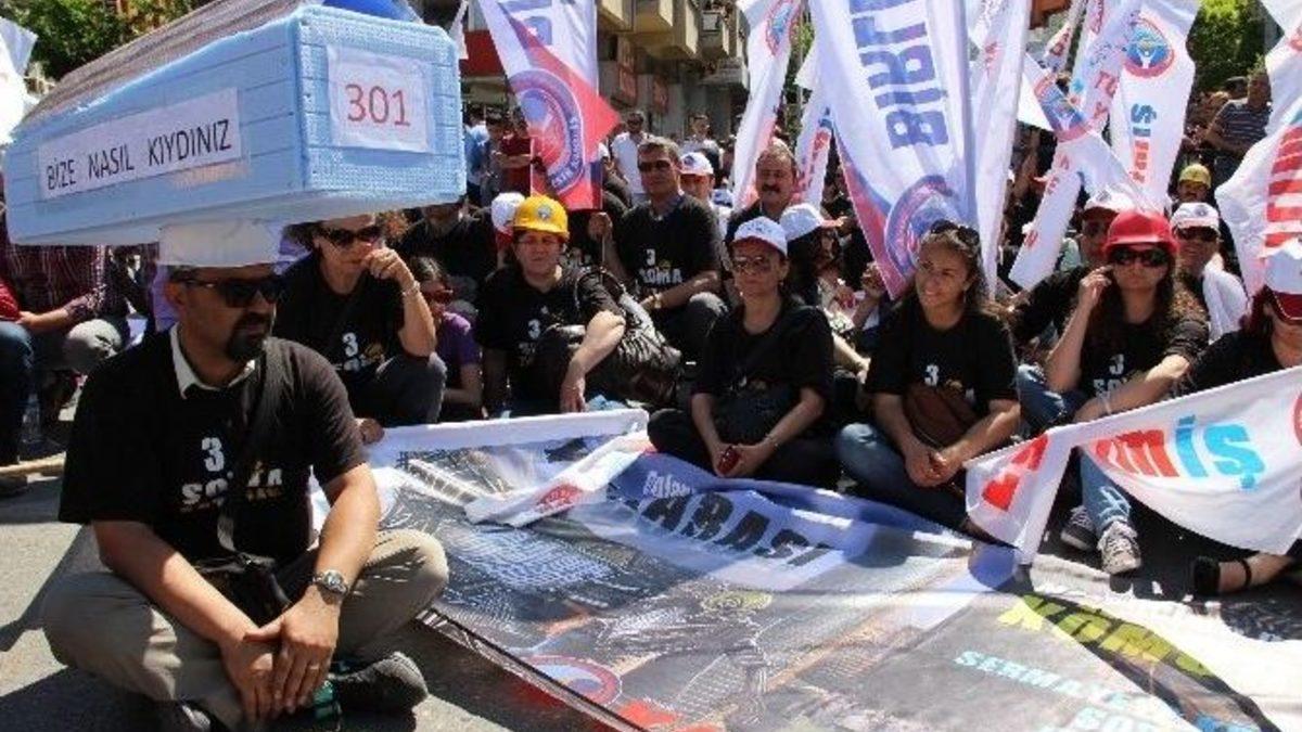 Manisa’nın Soma ilçesinde yaşanan maden faciasının yıldönümünde Birleşik Kamu İş Sendikasına bağlı 250 üye, Soma madenci heykelinin bulunduğu Beşyol ağzında önce oturma eylemi yaptı ardından bir grup sendika üyesi maden şehitliğine yürüdü.Manisa’nın Soma ilçesinde geçen yıl 13 Mayıs tarihinde yaşanan maden faciasının ardından Birleşik Kamu-İş Sendikası Konfederasyonuna bağlı üyeler Beşyol madenci heykeli önünde oturma eylemi yaptı. Madenci heykeli önünde 250’ye yakın sendika üyesi toplanarak yolda oturma eylemi yaptı. Burada ellerinde dövizle ’Soma’nın hesabı sorulacak’ diye sloganlar atıldı.Bir grup Beşyol ağzında oturma eylemine devam ederken bir grup üye de maden şehitliğine doğru yürüdü. Maden şehitliğine gelen sendika üyeleri mezarlara karanfil bırakarak arkadaşları için dua etti.