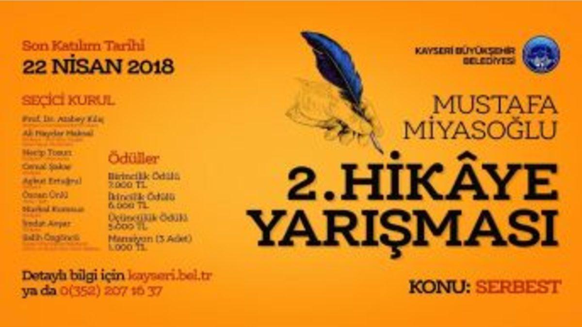 Büyükşehir Belediyesi, Emir Kalkan anısına düzenlenen hikaye yarışmasının ardından bu kez Mustafa Miyasoğlu’nun ismini yaşatıyor. Kayseri’nin yetiştirdiği en önemli yazarlardan olan Mustafa Miyasoğlu anısına düzenlenen hikaye yarışmasına katılmak isteyenler 22 Nisan’a kadar başvurularını yapabilecekler.Büyükşehir Belediyesi kültür sanat etkinlikleri kapsamında düzenlenen hikaye yarışması devam ediyor. Kayseri’nin yetiştirdiği en önemli yazarlardan biri olan Mustafa Miyasoğlu anısına birbirinden düzenlenen hikaye yarışması büyük ilgi görüyor.Hikaye yarışmasına başvurular 22 Nisan 2018 tarihinde sona erecek. Yarışmada birinciye 7 bin TL, ikinciye 6 bin TL, üçüncüye 5 bin TL ödül verilecek. Yarışmada mansiyon ödülü ise 1000 TL olarak belirlendi. Hikaye yarışmasına katılmak isteyenler detaylı bilgiyi www.kayseri.bel.tr adresinden öğrenebilecek.Yarışma sonuçları 4 Haziran 2018 tarihinde açıklanacak.