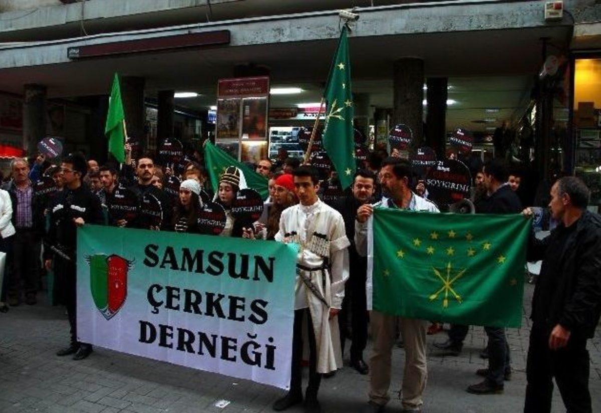 Samsun Çerkez Derneği, Çarlık Rusya’nın Çerkez halkına uyguladığı soykırım ve sürgünün 150. yıl dönümünü düzenledikleri eylemle andı.Konak Sineması önünde düzenlenen eylemde konuşan Samsun Çerkez Derneği Gençlik Komisyonu Üyesi Abdullah Burak San, “21 Mayıs 2014 Çarlık Rusya’nın kolonici politikaları ve stratejik hedefleri doğrultusunda Çerkez halkına uyguladığı soykırım ve sürgünün 150. yıl dönümüdür. Çerkez soykırım ve sürgünü, insanlık tarihinin en acı ama en az bilinen trajedilerinden birisidir. Çerkezler, atalarının yaşadığı trajediyi ve anayurtlarını hiçbir zaman unutmadılar” dedi.Çabalarının Çerkez soykırımı ve sürgününü, Türk ve dünya kamuoyuna anlatmak olduğunu belirten Samsun Çerkez Derneği Başkanı Sedat Uygun, “Çarlık Rusya’sı, tam 101 yıl süren 1763 - 1864 savaşı süresince Çerkezleri sistemli olarak katliama ve etnik temizliğe tabi tutmuştur. Talebimiz, Rusya Federasyonu, Türkiye ve diğer devletler tarafından ‘Çerkez Soykırım ve Sürgünü’ tanınmalı ve Rusya Federasyonu Çerkezlerden özür dilemelidir. Rusya Federasyonu, Çerkez halkına yaşadıkları ülkelerin vatandaşlığını içeren çifte vatandaşlık vermelidir. Çerkezler geçmişi unutmadan hem kendileri ve hem de diğer halklar için onurlu bir gelecek istemektedir” diye konuştu.