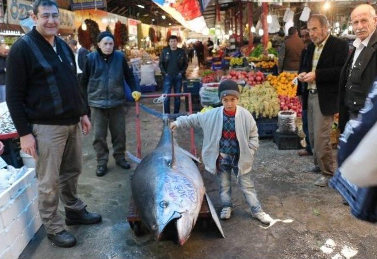 Denizi olmayan Sivas’ta bir balıkçının satışa sunduğu 2 buçuk metrelik boyu ve 305 kilo ağırlığı olan Orkinos balığı vatandaşlardan yoğun ilgi gördü.Marmara Denizi’nde yakalanan 2 metre 48 santimetre uzunluğunda 305 kilo ağırlığındaki orkinos balığına vatandaşlar yoğun ilgi gösterdi. Kilosu 20 lirada satışa sunulan dev orkinos balığını görenler hatıra fotoğrafı çekinmeyi ihmal etmedi. Sivas sebze halinde balıkçılık yapan Fetih Şahin Bingöl, 305 kiloluk dev balığı Bandırma’dan Sivas’a getirdiklerini söyledi. Bingöl, "Geçen hafta 250 kiloluk bir orkinos getirdik. Bu sene rekor bizde. En büyük balık bu sene geldi. Geçen sene 225, bu senenin başında ise 250 kilo ve bu da tam 305 kilo. Yine rekor Sivas’ta. İnşallah öğleden sonra keseceğiz. Bugünde bitirmeyi hedefliyoruz. Orkinos’a vatandaşın ilgisi büyük. Şu an listemizi yaptık. Balığın yarısı şuanda satılmış durumda. Bu balığı sabah arabadan 12 kişiyle zor indirdik. Kurbana 7 hisselik kurban olur. Kurban eti gibi de kıpkırmızı eti var. Çocuklar da en faydalı balık budur. Orkinos balığının sırtındaki siyah et boy uzatmaya, kalp hastalığına, şeker hastalığına birebir bu balık. İnşallah akşama doğru kalmaz biter" diye konuştu.İlk defa böyle bir balık gördüğünü söyleyen Şevket Karpuz, "Sivas’ta deniz olmadığı için böyle bir balığı ilk defa gördük. Yeni görüyorum böyle bir balığı" dedi.