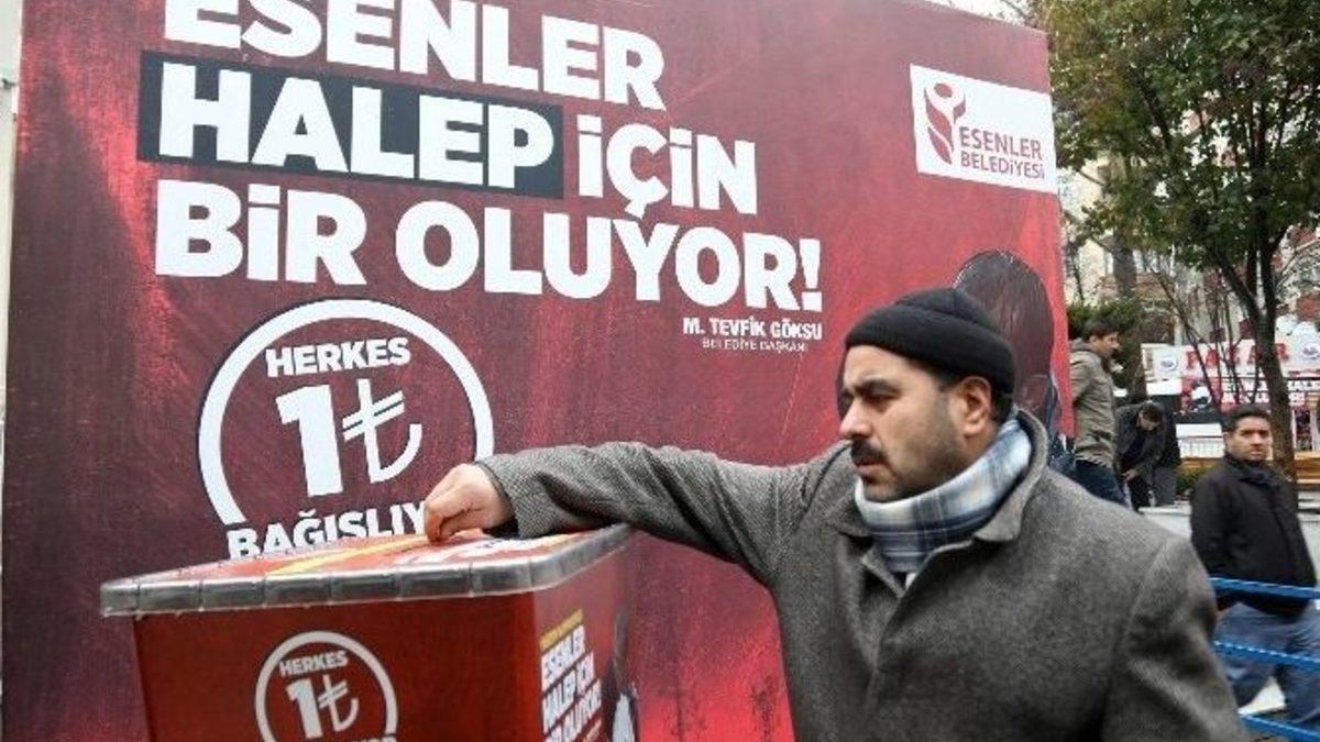 Esenler Belediyesi, Suriye’de zor günler yaşayan Halepli Müslümanlar için yardım kampanyası başlattı. Vatandaşlar, bağış kutularına en az ‘1’ TL olmak üzere yardımda bulunuyor.Halepli Müslümanlar için ‘Herkes 1 TL bağışlıyor’ sloganıyla Esenler Belediyesinin başlattığı yardım kampanyası kısa sürede hızla yayıldı. Bugün cuma namazı çıkışı Esenler Dörtyol Meydan’da kurulan yardım kutularına vatandaşlar bağışta bulundu. Esenler Belediye Başkanı Mehmet Tevfik Göksu da meydana gelerek yardım eden vatandaşları ziyaret etti. "Herkes ailesindeki her bir kişi için 1 TL bağışlasın" diyen Göksu, kendi ailesi için yardım kutusuna 6 TL koydu.Başkan Göksu, “Biz Esenler’de her bir kardeşimizden her bir kişi için 1 TL dedik ancak Esenler’deki kardeşlerimiz 1 TL’den daha fazlasını vereceklerdir. Çünkü biliyorlar ki bu verdikleri her bir iyiliğin karşılığında Cenab-ı Hakk onlara bire yediyüz verecek. Çünkü bu işler böyledir. Siz bir verirseniz, Allah onun karşılığında size daha fazlasını verir diyor Peygamberimiz. Bunun için ben bu kampanyamızın hayırlı olmasını diliyorum” ifadelerini kullandı.Yardım kampanyasına destek veren bir vatandaş ise, “Görüyorsunuz kış mevsimi geldi. Oradaki çocuklarımız, insanlarımız perişan durumdayken bizim burada rahat bir şekilde evlerimizde durmamız vicdanen herkesi üzer. Biz oradaki çocuklarımız için elimizden ne geliyorsa karınca kararınca değil, aslında daha fazlasını yapmaya gayret edeceğiz. Biz evlerde dahi üşürken çocuklar oralarda çadırlarda kalıyor. Bizim onları düşünmemiz gerek” diye konuştu.