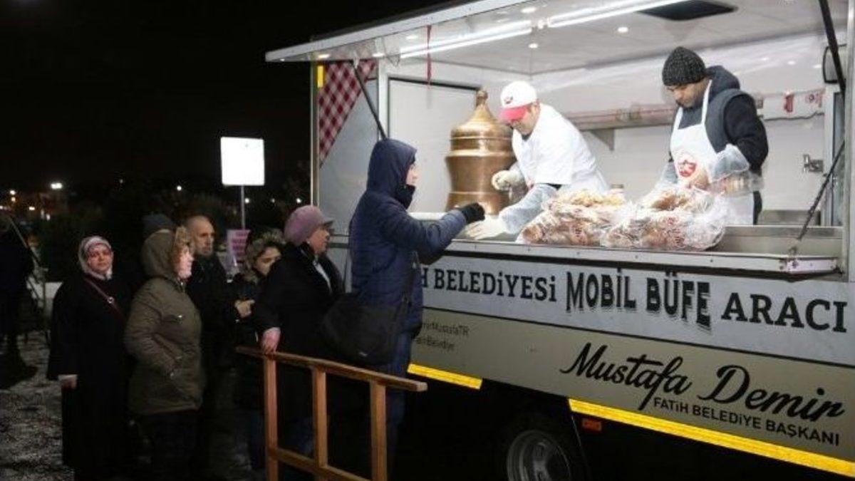 İstanbul’da etkili olan yoğun kar yağışı sebebiyle Fatih’te işe giden vatandaşlara ve hastanelerin acil servislerindeki hasta yakınlarına çorba ikramı yapıldı.İstanbul’da yaklaşık 1 haftadır etkili olan yoğun kar yağışı altında işe giden vatandaşlar için Fatih Belediyesi tarafından çorba ikramı yapıldı. Belediye ekipleri, sabahın erken saatlerinde Aksaray Meydanı başta olmak üzere Eminönü, Beyazıt, Yenikapı Marmaray girişinde, hastanelerin acil servisleri önünde vatandaşlara sıcak çorba dağıtarak soğuk havalarda vatandaşların içini ısıttı.Ekipler, soğuktan etkilenen vatandaşların içini ısıtmak için yaklaşık 5 bin kişilik çorba dağıttı. Bunun yanı sıra akşamları üniversite ve kamu hastanelerinin acil servislerinin girişlerinde hasta yakınlarına çorba ikramı devam ediyor. Belediyenin soğuk hava koşullarıyla mücadele çalışmaları kapsamında dağıtılan çorbalar hasta yakınları ile işe gitmek için yola çıkan vatandaşlardan da tam not aldı.