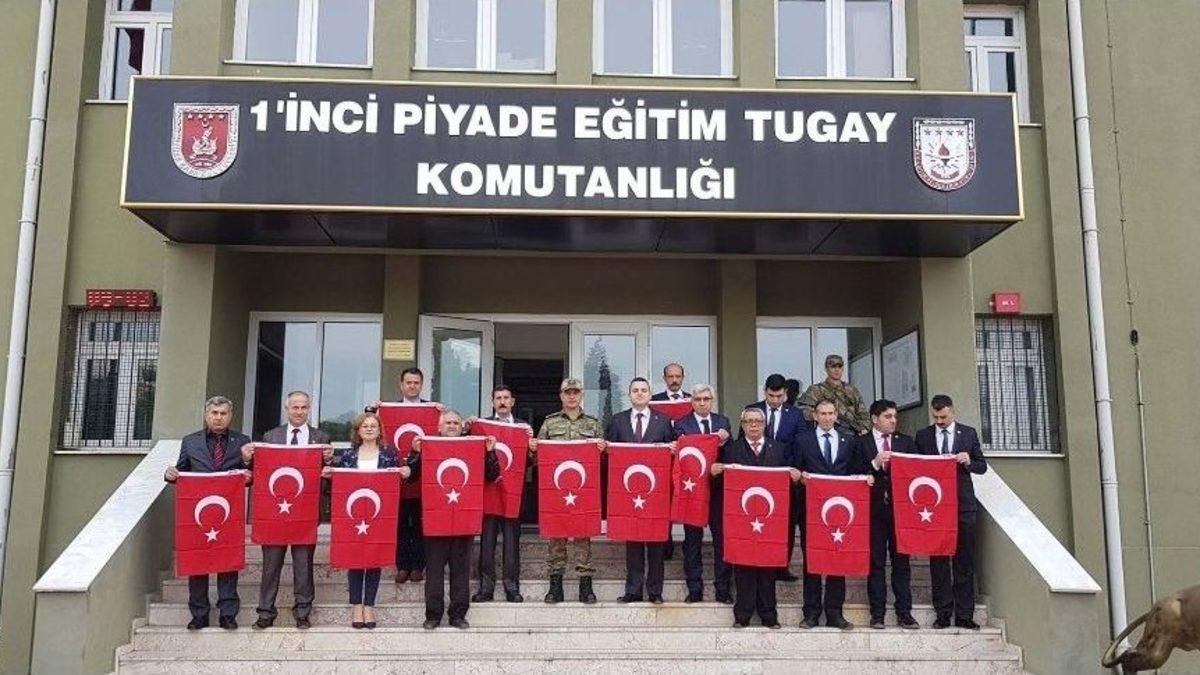 Türkiye Harp Malulü Gaziler Şehit Dul ve Yetimleri Derneği Manisa Şubesi Başkanı Gazi Ümit Taydaş beraberindeki şehit yakınları ve gazilerle Manisa 1.Piyade Eğitim Tugay Komutanı Albay Güven Dere’ye makamında ziyaret gerçekleştirerek Afrin’e yönelik yapılan Zeytin Dalı Harekatına desteklerini iletti.Türkiye Harp Malulü Gaziler Şehit Dul ve Yetimleri Derneği Manisa Şubesi Başkanı Gazi Ümit Taydaş, Salihli İrtibat Bürosu Sorumlusu Şehit Babası Abdullah Varol, Akhisar İrtibat Bürosu Sorumlusu Gazi Celalettin Çabuk ve çok sayıda şehit yakını ve gazi 1.Piyade Er Eğitim Tugay Komutanı Albay Güven Dere’ye makamında ziyaret gerçekleştirdi.Türkiye Harp Malulü Gaziler Şehit Dul ve Yetimleri Derneği Manisa Şubesi Başkanı Ümit Taydaş burada yaptığı konuşmada, “Ülkemiz tüm terör örgütleriyle son terör örgütü mensubu etkisiz hale getirilinceye kadar sürecek operasyonlarına devam etmektedir. Devletimiz sınırlarımızın güneyinde PKK uzantısı PYD ve YPG terör örgütlerini ortadan kaldırmak üzere Afrin’e Zeytin Dalı Operasyonunu başlatmıştır. Bizler devletimizin yanındayız, ordumuzun yanındayız sizlere haklı mücadelemizde destek veriyoruz. Bize de ihtiyaç varsa şehit olmaya hazırız. Tabipler Birliğinin yaptığı gibi ülke birlikteliğimizin korunması doğrultusunda askerimizin yaptığı mücadeleyi sulandırmaya çalışan açıklamaları kabul etmiyoruz. Tabipler Birliğini kınıyoruz. Şimdi birlik zamanıdır. Tüm halkımızı birlik bütünlük uzantısında devletimizin yanında olmaya davet ediyoruz. Devletimizin haklı mücadelesini destekliyoruz” dedi.1.Piyade Er Eğitim Tugay Komutanı Albay Güven Dere de, “Memleketimizi savunmak için şehit olmamız gerekirse olmaya hazırız. Terör örgütlerine gereken ders verilecektir. Bu anlam dolu ziyaretinizden dolayı çok teşekkür ederim” diye konuştu.Ziyaret sonrası 1.Piyade Er Eğitim Tugay Komutanlığının önünde Albay Güven Dere, Başkan Gazi Ümit Taydaş tüm şehit aileleri ve gaziler Türk Bayrağı açarak fotoğraf çektirdi.