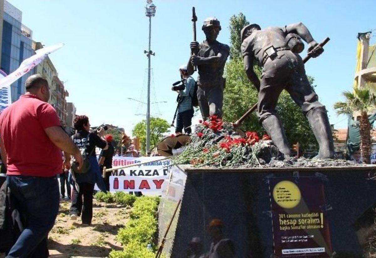 Manisa’nın Soma ilçesinde yaşanan maden faciasının yıldönümünde Birleşik Kamu İş Sendikasına bağlı 250 üye, Soma madenci heykelinin bulunduğu Beşyol ağzında önce oturma eylemi yaptı ardından bir grup sendika üyesi maden şehitliğine yürüdü.Manisa’nın Soma ilçesinde geçen yıl 13 Mayıs tarihinde yaşanan maden faciasının ardından Birleşik Kamu-İş Sendikası Konfederasyonuna bağlı üyeler Beşyol madenci heykeli önünde oturma eylemi yaptı. Madenci heykeli önünde 250’ye yakın sendika üyesi toplanarak yolda oturma eylemi yaptı. Burada ellerinde dövizle ’Soma’nın hesabı sorulacak’ diye sloganlar atıldı.Bir grup Beşyol ağzında oturma eylemine devam ederken bir grup üye de maden şehitliğine doğru yürüdü. Maden şehitliğine gelen sendika üyeleri mezarlara karanfil bırakarak arkadaşları için dua etti.